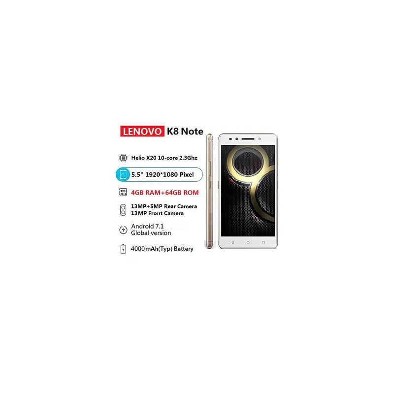 Consejos:Antes de comprar este producto,asegúrese de que la frecuencia de la red de su país/región sea compatible.El ROM de este teléfono apoya a OTA y es multilingüe.Descripción:El Lenovo K8 Note hace alarde de una pantalla Full HD de 5.5 pulgadas (1,080 x 1,920 píxeles) y cuenta con un sensor de huellas dactilares trasero. El teléfono inteligente funciona con 4 GB de RAM y se combina con un conjunto de tres procesadores: Cortex A72 de doble núcleo a 2,3 GHz + Cortex A53 de cuatro núcleos a 1,85 GHz y Cortex A53 de cuatro núcleos a 1,4 GHz. La tarjeta gráfica Mali-T880 MP4 genera una visualización de buena calidad al reproducir videos HD y juegos de alta gama. El teléfono inteligente se ejecuta en el sistema operativo Android v7.1 Viene en un cuerpo elegante con bordes biselados.Parámetros técnicos:Marca: LenovoModelo: K8 NOTESistema Android7.1.1CPU: Helio X20(MT6797D) Deca Core 2.3GhzVida:Baterías de litio de 4000 ng / H, baterías internasEspera activa: 15 días como máximoDuración máxima de las llamadas: 24,7 horas (4G)Cámara:Cámara principal:Cámaras dobles - Sensores primarios 13mp + sensores de profundidad 5MP con dos LED flashCámara delantera:La Cámara 13 MP selife con el flash de la fiesta.VozAltavoz únicoDolby sound effectsTeclas musicales para enchufes de 3,5 milímetrosPuertoMicro-USBmicroSD3.5mm PuertoConexión / radioDatos: GPRS, Edge, hspa +, LTEVelocidad: LTE 150 Mbps (DL) / 50 mpbs (UL) cat4Red 4G: Banda FDD LTE 1 / 3 / 5 / 8 - TDD LTE 40Red 3G: Banda de la WCDMA 1 / 5 / 82G Red: Banda GSM 2 / 3 / 5 / 8WLAN: lugares críticos de Wi - Fi 802.11 B / g / N, Wi - FiBluetooth® 4.2Apoyo a los GPSFM - radio.Pulgadas13.97cm (5.5) FHD (1920 x 1080) IPS, con 401 PPI, 2,5D vidrioSIMDual nano SIM slot SensorAcelerómetros, sensores de luz ambiental, brújulas electrónicas, giroscopios, sensores de proximidad, lectores de huellas digitales segurosParámetros de aparienciaParámetros de tamaño(LxWxT):154.5 x 75.9 x 8.5 mm Parámetros de peso:180g