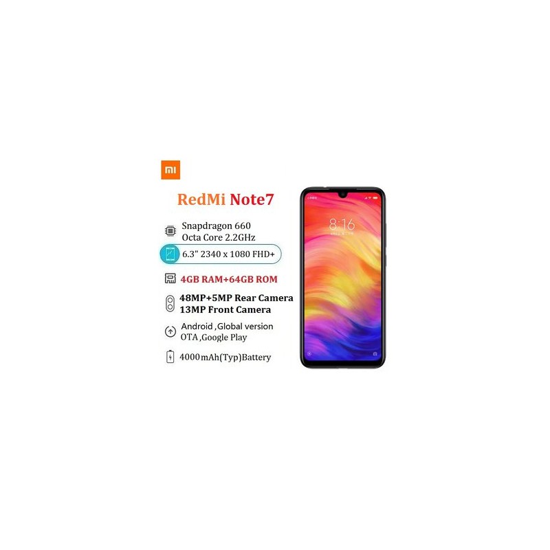 Una nueva experiencia a nivel de un flagship,cuantos más píxeles, más clara será la imagen. Redmi Note 7 utiliza un sensor de 48 MP, es decir, con cuatro veces más número de píxeles que un teléfono típico de 12 MP. Además, en el modo de 48 MP, un solo píxel mide solo 0,8 μm, originando una resolución nada menos que asombrosa.Amplía el zoom todo lo que quieras y recorta pequeños detalles para crear fotos distintas. Las fotos de paisajes panorámicos mantienen su nitidez incluso cuando se amplían. Redmi Note 7 ofrece un sinfín de posibilidades con su cámara de 48 MP (propia de un dispositivo flagship).Tan sencillo como tener un algoritmo poderoso en la palma de tu mano.Con un solo toque, la cámara captura automáticamente múltiples imágenes y las combina en una sola foto de alta calidad. Además, Redmi Note 7 también es compatible con el modo de alta sensibilidad que combina 4 píxeles en un único superpíxel de 1,6 μm, produciendo una foto nocturna de alta calidad de 12 MP. Equipada con un gran sensor de 1/2 pulgada, la cámara puede capturar más luz en entornos más oscuros originando fotos más brillantes con menos ruido.El uso de Snapdragon™ 660 significa que Redmi Note 7 ha alcanzado un estatus casi flagship.Además, esta edición especial del procesador con IA proporciona una velocidad de reloj de la CPU más rápida para un funcionamiento increíblemente suave y juegos con alta capacidad de respueta.Entre los teléfonos más reconocidos, la pantalla con notch de gota se ha convertido en una solución común para maximizar la visualización de la pantalla gracias a la forma en la que aloja la cámara frontal. Con una resolución de 2340 x 1080, esta pantalla supera a la mayoría de los televisores de alta definición. En conjunto, este teléfono tiene una pantalla de gran tamaño que mantiene su claridad hasta en los detalles más pequeños.
