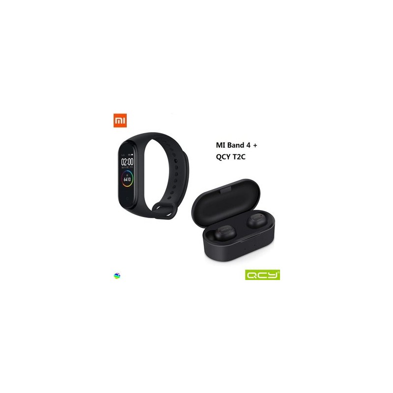 QCY T2C Audifonos Bluetooth:Micrófono de silicona de alta sensibilidad.Tecnología antiinterferencia y reducción de ruido CVC 6.0.Mejor reconocimiento de voz.Diseño ergonómico, se adapta al contorno de las orejas.Estuche de carga incorporado de 800 mAh para energía de respaldo. Bluetooth: V5.0.Conectividad:Inalámbrico Respuesta de frecuencia: 20-20000Hz.Impedancia: 32ohms.Sensibilidad: 108dB ± 3dB.Tiempo de conversación: 4h. Material: ABS y Metal.Capacidad de la batería - Auricular: 45mAh.Base de carga: 800mAh (incorporado).Dimensiones: 8 x 4.5 x 3cm / 3.15 x 1.77 x 1.18" (aprox.)Mi Band 4:Tamaño de la pantalla: 0,95 pulgadasRetroiluminación de la pantalla: Brillo máximo≥400nit, brillo ajustableMaterial de la caja: PC plásticoBluetooth: 5.0Tiempo de vida: 20 díasTipo de batería: Batería de seguridad de polímero de iones de litio de 135 mAh incorporadaSistema compatible: Android 4.4 y superior, iOS 9.0 y superiorSensor: sensor de aceleración triaxial, sensor de frecuencia cardíaca PPGMaterial de la pulsera: TPUTipo de pulsera: pulsera desmontableAncho de la pulsera: 18mmPulsera de longitud ajustable: 155-216mmRAM: 512KBMemoria flash: 16MBManera de carga: 2 pin pin pogoTiempo de carga: ≤2 horasTip:El brazalete es la versión china,sólo soporta inglés