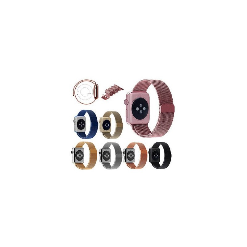 Correa diseñada especialmente para Apple Watch Series 1, 2, 3, 4 y 5. Fabricado con los mejores materiales disponibles, en acero inoxidable, y con un broche magnético. Elegante y único extensible en 12 diferentes colores y disponible para los tamaños 38, 40, 42 y 44 mm.Colores disponibles:NEGROPLATADORADOCAFEROSA DORADOAZUL MARINOTORNASOLFUCSIALILAMENTAROJOBLANCOSelecciona el tamaño y color de tu preferencia de la lista.